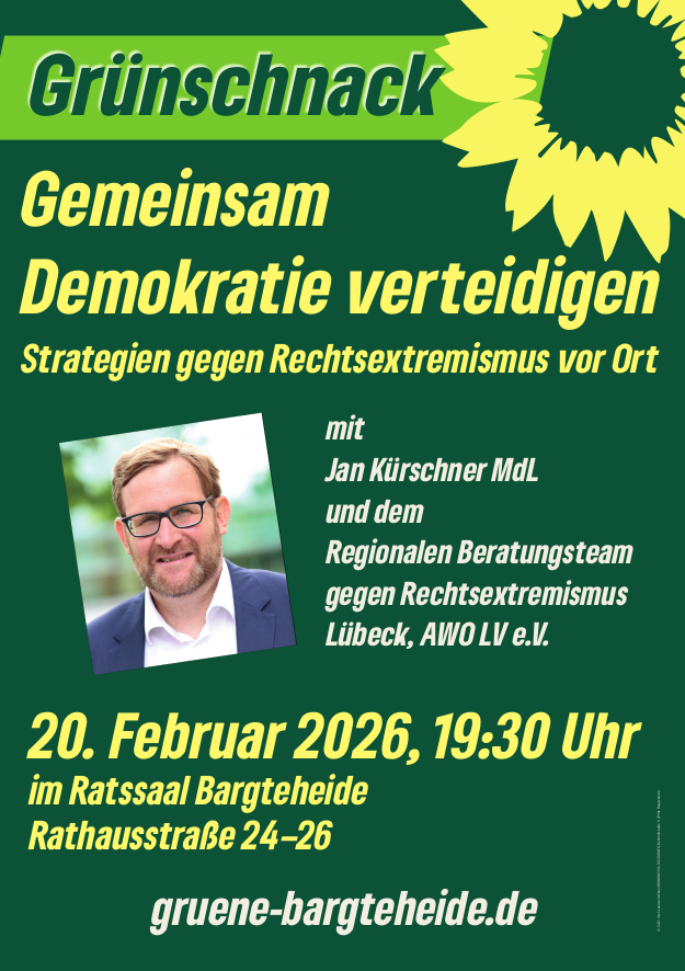 Informations- und Diskussionsveranstaltung des Ortsverbands Bargteheide von Bündnis 90/Die Grünen zum Thema Rechtsextremismus. Der Schwerpunkt der Veranstaltung soll auf der aktuellen Situation in Bargteheide und Umgebung liegen. Zusammen wollen wir uns über die Lage ein Bild verschaffen und mögliche Gegenmaßnahmen diskutieren. Dabei wird uns das Regionale Beratungsteam gegen Rechtsextremismus Lübeck, AWO LV e.V. mit seiner fachlichen Expertise unterstützen.